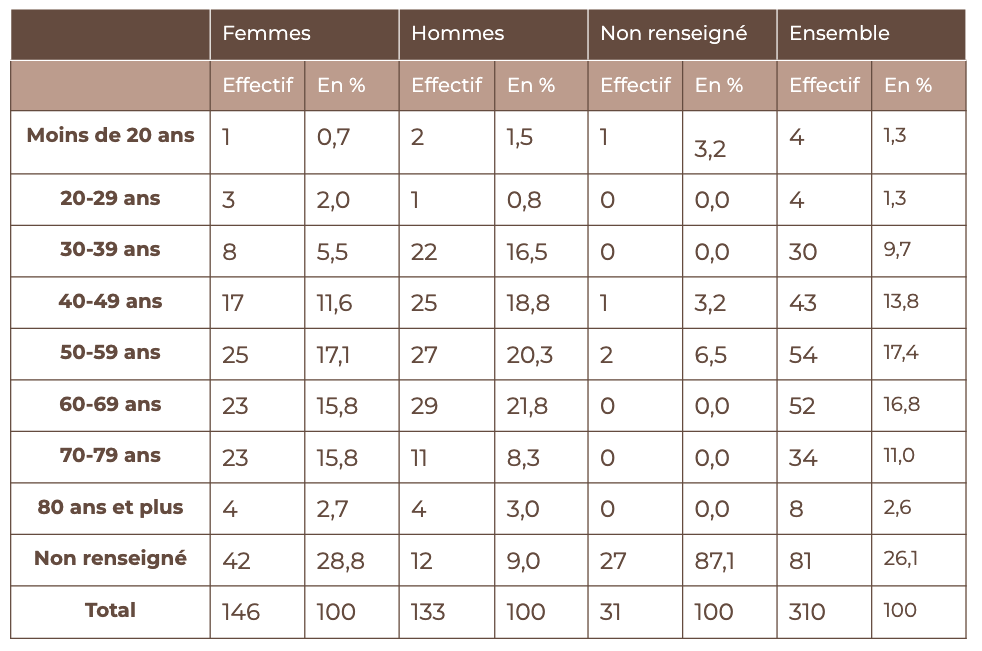 Une étude à partir de 310 chefs de famille admis aux secours vers 1838 permet d’en dresser le profil. Comme à Rouen ou en Bretagne, le tableau et le graphique ci-après mettent en exergue la condition nécessiteuse des individus admis au Bureau de bienfaisance de Charleville dans la première moitié du xixe siècle. Bien que la part d’entre eux dont le sexe n’est pas renseigné ne soit pas négligeable (31/310), presque la moitié des chefs de ménage admis sont des femmes (146/310). Cette forte présence des femmes est d’autant plus capitale que leur statut de cheffe de famille renvoie automatiquement à des profils de veuves ou célibataires. Seules ou sans partenaire, elles étaient privées des revenus d’un conjoint – ce qui laisse supposer qu’elles disposaient de peu de ressources. De manière plus générale, le tableau révèle également qu’environ un tiers des chefs de famille – tous sexes confondus – étaient âgés de 60 ans et plus (96/310) au moment de leur admission au Bureau. Leur grand âge, cumulé à d’éventuelles dégradations de leur état physique, pouvait les faire basculer dans la précarité.