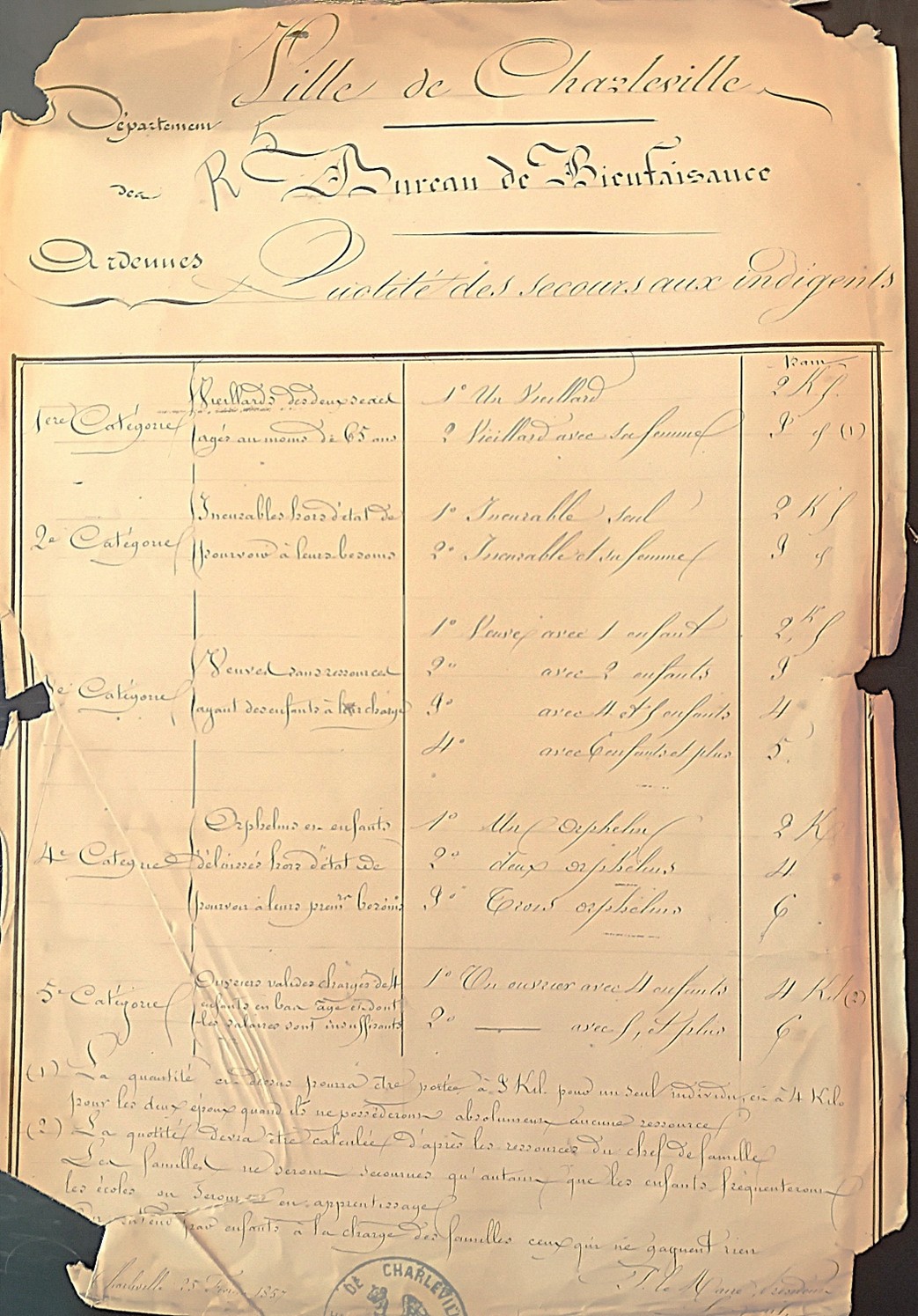 Avant d’admettre une personne aux secours, le Bureau de bienfaisance de Charleville devait s’assurer qu’elle était domiciliée dans la commune et qu’elle remplissait au moins une des conditions d’accès à l’établissement. Un document émis le 25 février 1857 par les administrateurs du Bureau détaille les groupes d’individus concernés par les secours, à savoir ici du pain, dont la quantité est mesurée en kilogrammes. Cinq catégories de bénéficiaires ont été établies, parmi lesquelles figurent des personnes âgées d’au moins 65 ans, des incurables, des enfants délaissés ou encore des individus surchargés d’enfants et dont les ressources sont insuffisantes pour subvenir à leurs besoins. La quantité des secours délivrés était proportionnelle à la détresse des nécessiteux et à la taille de leur foyer. L’assistance fournie impliquait en retour les conditions que les familles devaient respecter pour être assistées – notamment la nécessité de scolariser leurs enfants ou de les placer en apprentissage. Cette condition souligne la mission plurielle du Bureau de bienfaisance, qui n’agit pas seulement à des fins humanitaires, mais aussi par crainte que les secourus ne s’enlisent dans une situation insurmontable et préjudiciable pour la société.