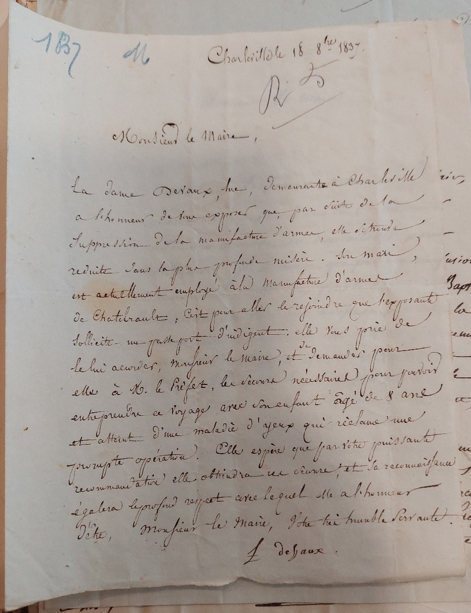 Bien que ce Bureau de bienfaisance ait joué un rôle clef dans les politiques d’assistance mises en place exceptionnellement en temps de crise – que ce soit au moment de fermeture de la manufacture d’armes ou lors des hivers rigoureux de 1846-1847 – son efficacité reste à relativiser. Dans une lettre adressée au maire de Charleville le 4 février 1837, le préfet des Ardennes signale « plusieurs inconvénients qui résultent du mode adopté pour la distribution des secours » et rappelle que « le mandement de ces secours ne pouvait être fait qu’au profit des parties prenantes ». Il est probable que les administrateurs du Bureau n’aient pas listé l’ensemble des ouvriers sans ouvrage à qui les secours étaient destinés et qu’une confusion se soit installée entre les bénéficiaires de ces secours et ceux qui n’en étaient pas concernés. Enfin, il est possible que certains de ces salariés en détresse ne bénéficiaient pas de ces aides. Un lot de demandes, rédigées par leurs soins et adressées directement au maire de Charleville pour obtenir la délivrance de secours, témoigne de cet écueil. Une d’entre elles a été rédigée le 18 octobre 1837 par Madame Devaux qui a sollicité le maire pour obtenir le passeport d’indigent – document requis pour être admis au Bureau de bienfaisance. Son obtention lui permettrait de bénéficier des fonds ouverts exceptionnellement après la fermeture de la manufacture d’armes pour rejoindre son mari, qui y travaillait anciennement, à Châtellerault où il s’était alors installé. Sa lettre insiste sur les difficultés que rencontre son foyer – notamment la maladie de son fils âgé de 8 ans. Sa lettre expose subtilement la légitimité, voire le bien-fondé de sa démarche : son époux a quitté la ville pour le travail et elle le soutient dans ce projet. Si son discours, tant sur le fond que sur la forme, est destiné à convaincre le maire de lui accorder les secours, il révèle l’instabilité de sa situation familiale face à laquelle le Bureau de bienfaisance de Charleville semble inactif. L’existence d’une dizaine de lettres de cette nature suggère que ce cas n’est pas isolé.